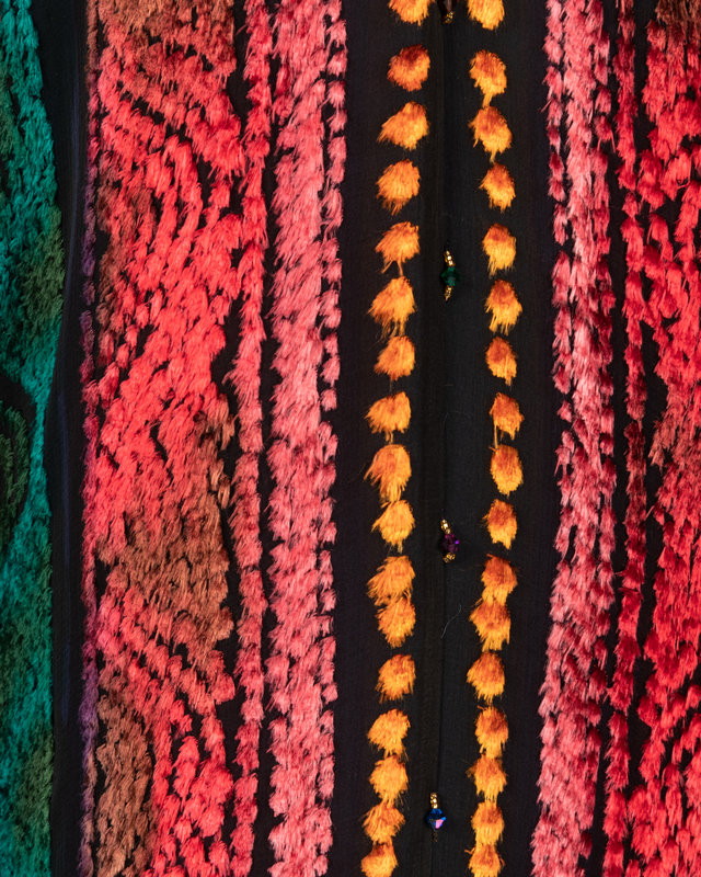 Multi-color silk and rayon blend dress with attached shawl and decorative beading along center seam and shawl hem.