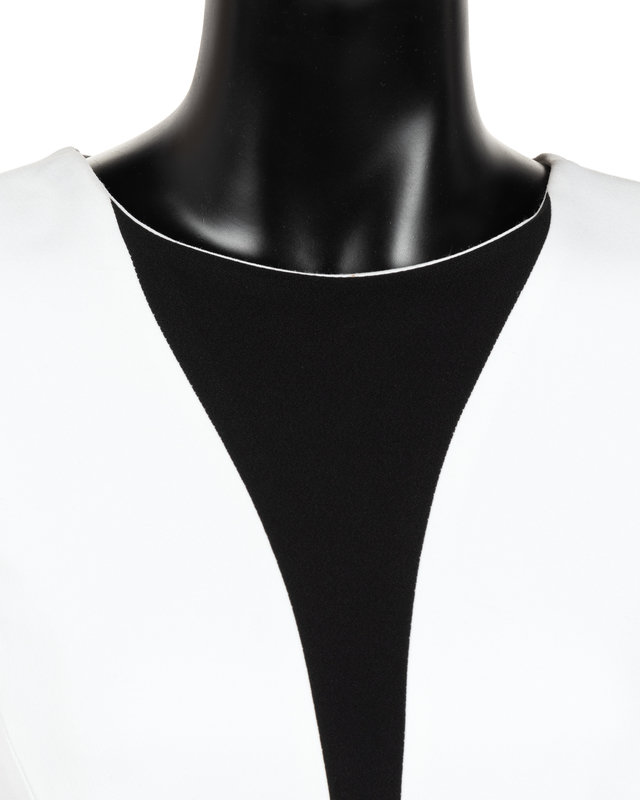 White crepe dress with crew neckline, short sleeves and a panel of black crepe extending down the center front. The dress closes down the center back with a zip. The dress comes with the retail labels still attached.