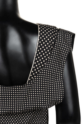 Sleeveless black silk dress with white polka dots and a scoop neckline. The bodice is cut in two layers with the outer layer falling into draped folds. The skirt tapers at the hem and is closed down the center front with buttons. The dress closes down the side seam with a zip.
