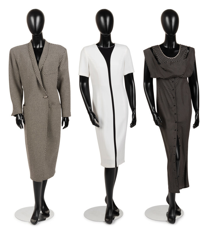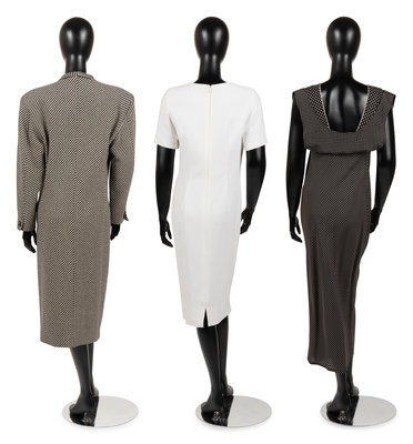 This lot includes three pieces; two dresses, one coat. Only the third dress has a known provenance.