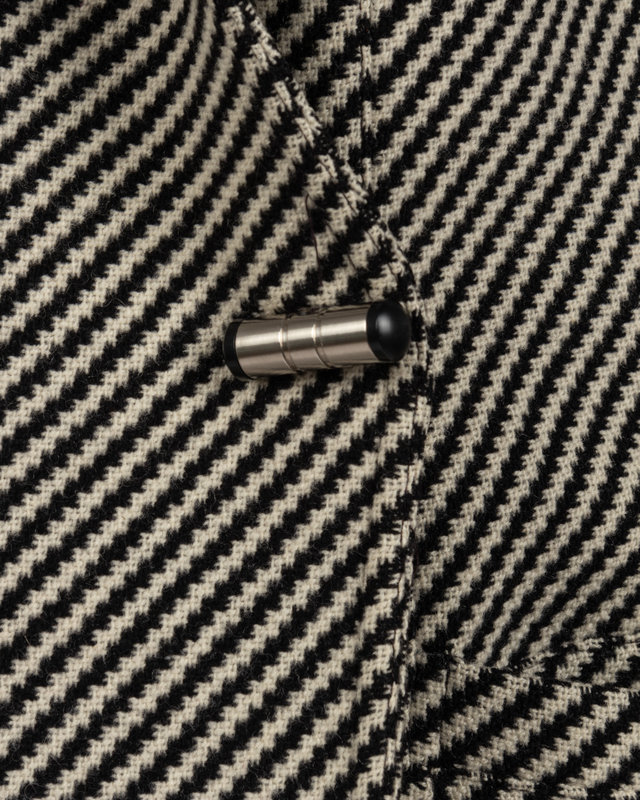 Black and white wool and cashmere coat woven with a diagonal stripe. The jacket closes with two buttons at the waistline with one button made of silver metal in a cylinder. Coat is lined.