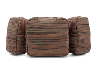 Vibrato leather Safari bag in brown and green on brown leather sling shoulder strap and base, three zippered individual pouches, silver-tone metal hardware, and topstitched in green.