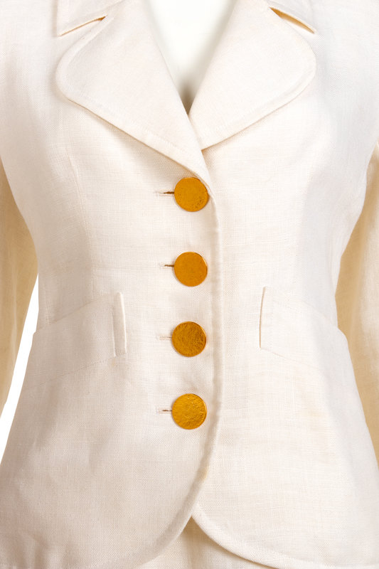 White linen two-piece skirt suit including rounded lapel jacket with center front gold-tone button closure; paired with matching straight fit skirt.