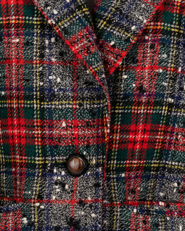 Gray wool tweed two-piece skirt suit including red plaid pattern jacket with center front button closures; paired with gray tweed straight fit skirt.