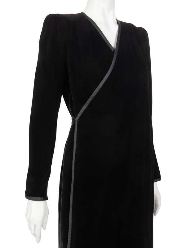 Black silk velvet long sleeve wrap dress trimmed in black braid ribbon and black satin ribbon waist tie.