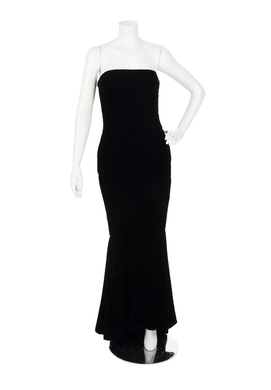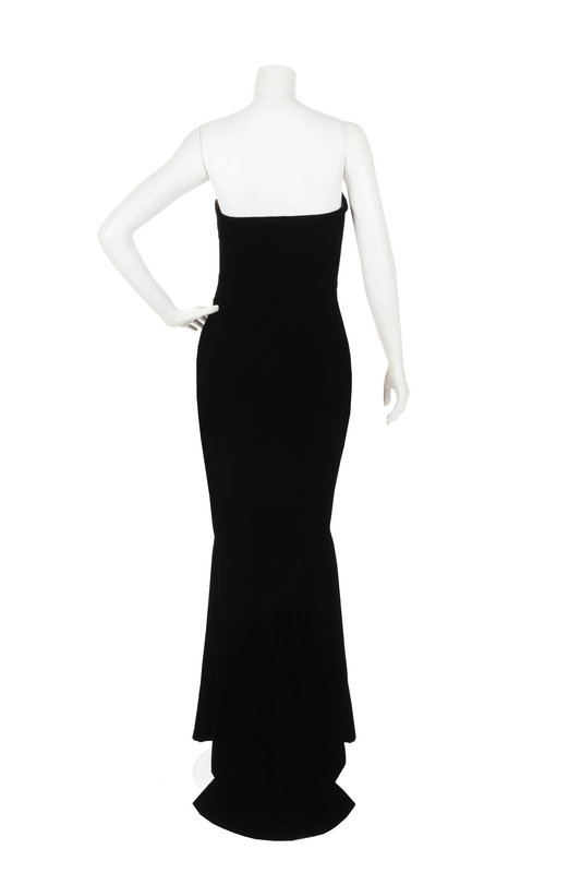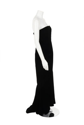 Black rayon/silk blend velvet strapless mermaid evening dress with inner structured bodice and left side double zipper closure.