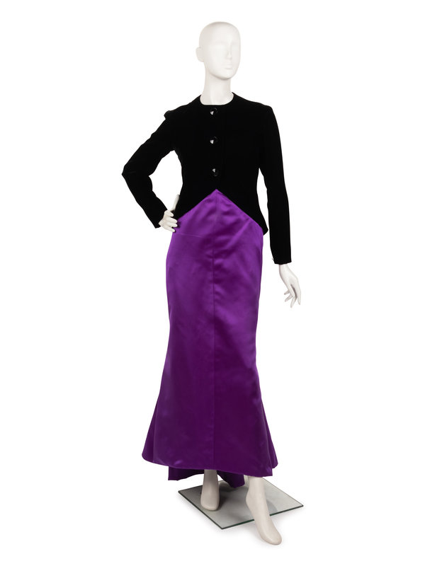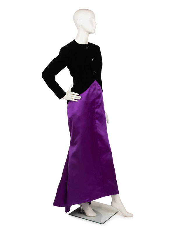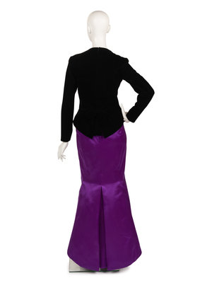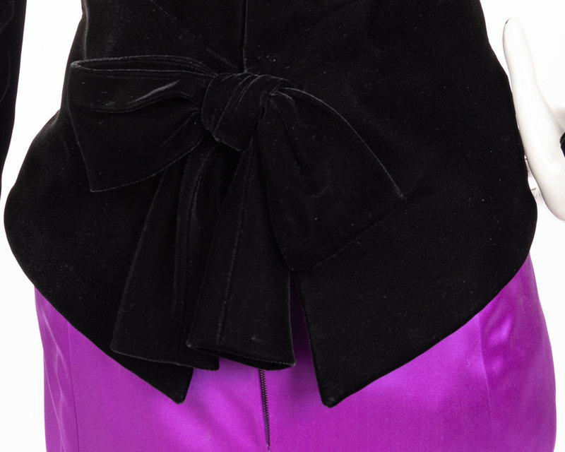 Black rayon/silk blend velvet and purple silk satin evening dress with jewel neck jacket-styled bodice with front button detail, long sleeves with zipper closures, center back zipper closure with back waist bow detail, and mermaid-style skirt with center back zipper closure.