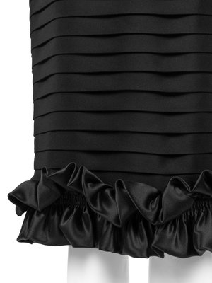 Black crepe long sleeve dress with pleated skirt and satin ruffle at hem.