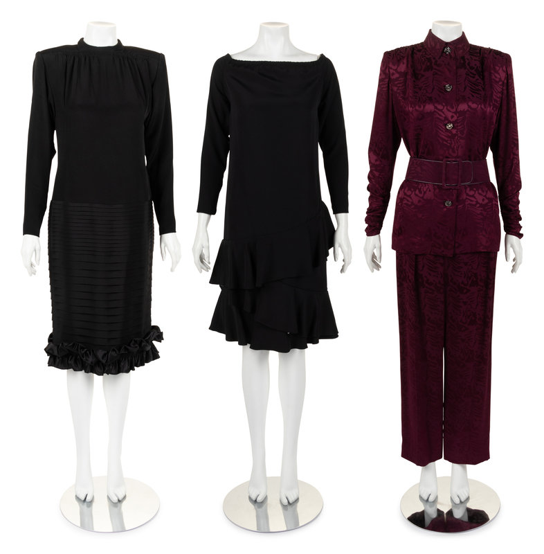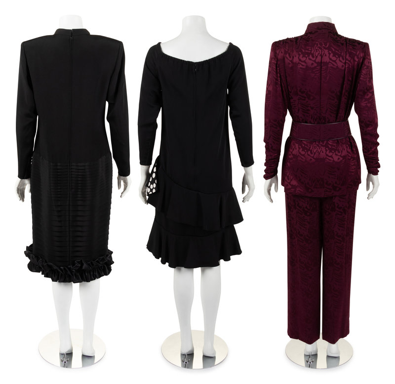 This lot includes five pieces; two dresses, one three-piece pant ensemble.