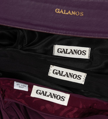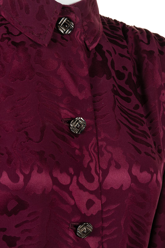 Wine satin jacquard two-piece ensemble including a long sleeve blouse with decorative buttons and ruching at wrists; paired with matching straight fit pants and belt.