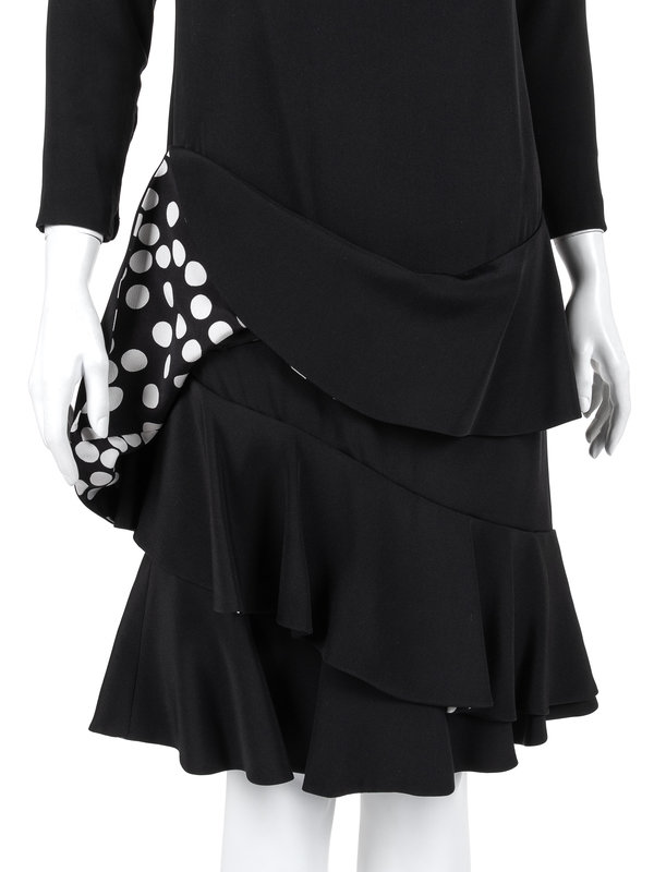 Black off the shoulder dress with asymmetrical flounce at hem faced in black and white polka dot printed satin.