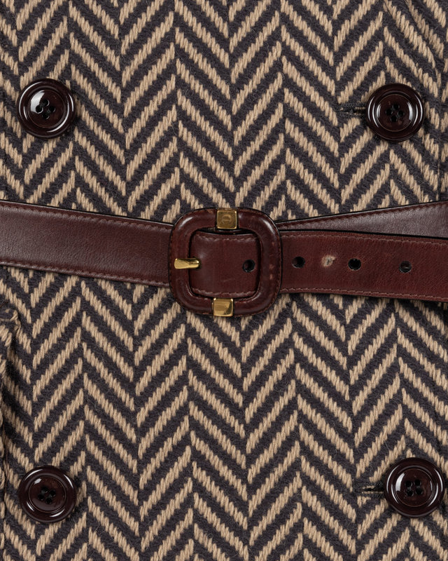 Three-piece skirt ensemble including a wool herringbone double breast jacket trimmed with sable fur, front hip patch flap pockets, belted waist, and front button closure; paired with gray printed satin blouse with center back button closure, and matching herringbone skirt.