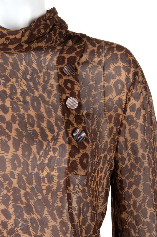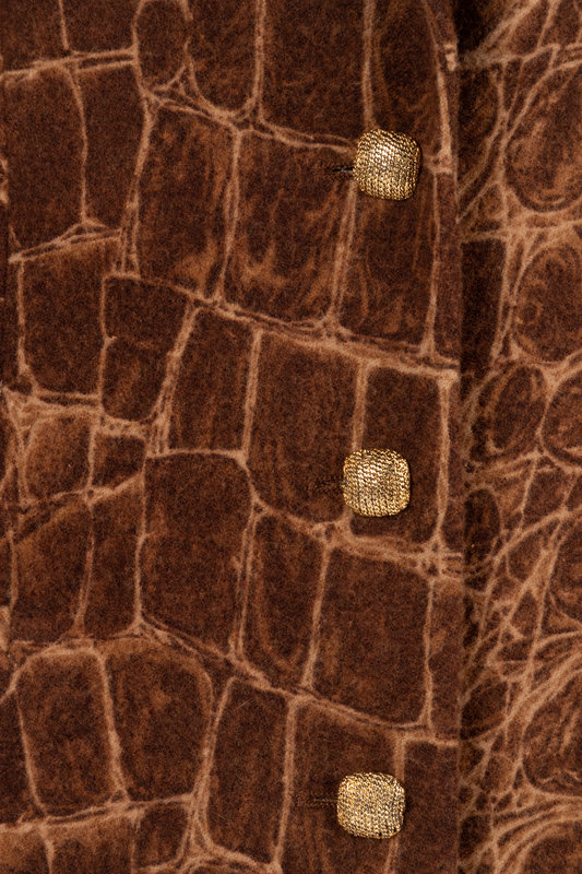 Three-piece ensemble including a wool giraffe print blazer with gold-tone buttons, silk leopard print long sleeve turtleneck top with off-center buttons, and brown wool skirt.
