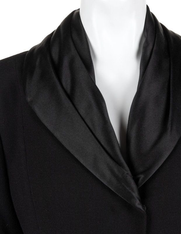 Black two-piece skirt suit including a jacket with draped satin lapels and tulip hemline; paired with matching straight fit skirt.