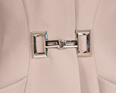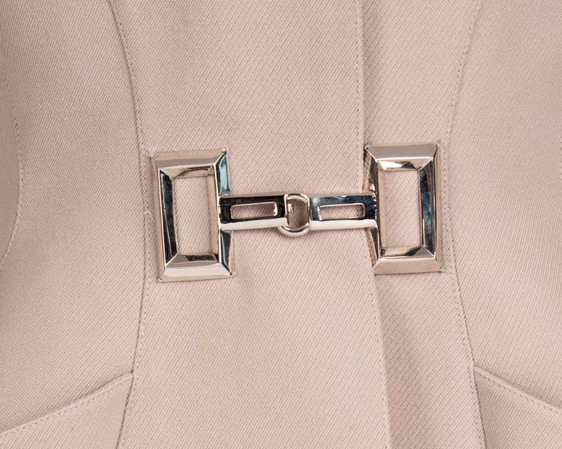 Light mauve wool two-piece skirt suit including a jacket with built-up neckline, in seam front hip pockets, and front waist buckle closure; paired with matching straight fit skirt.