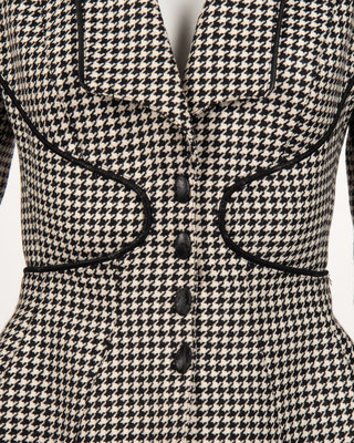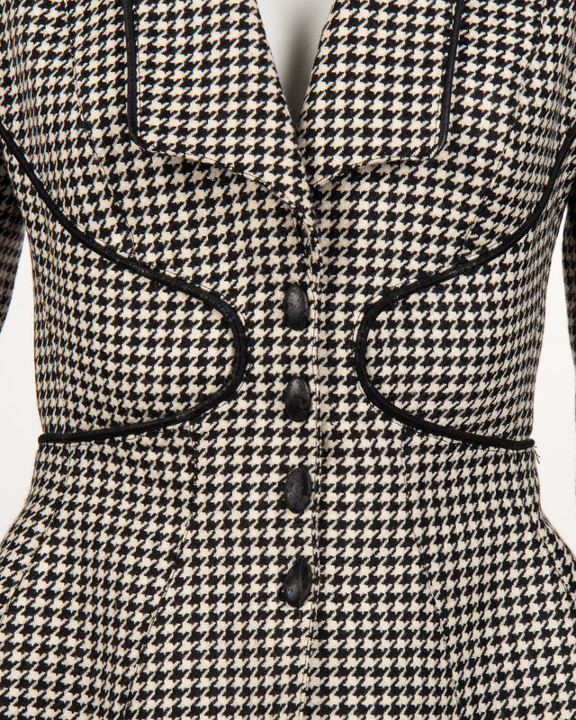 Black and white wool houndstooth two-piece skirt-suit including a jacket with squared roll collar lapel, flared jacket hem, and trimmed with black synthetic leather piping; paired with matching straight fit skirt.