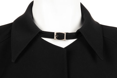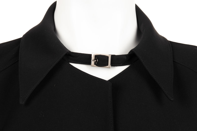 Black polyester two-piece pant suit including a jacket with a rolled pointed collar with buckled front, chest flap pockets, cuffed long raglan sleeves, and center front snap closure; paired with matching straight fit pants and detached tie belt.