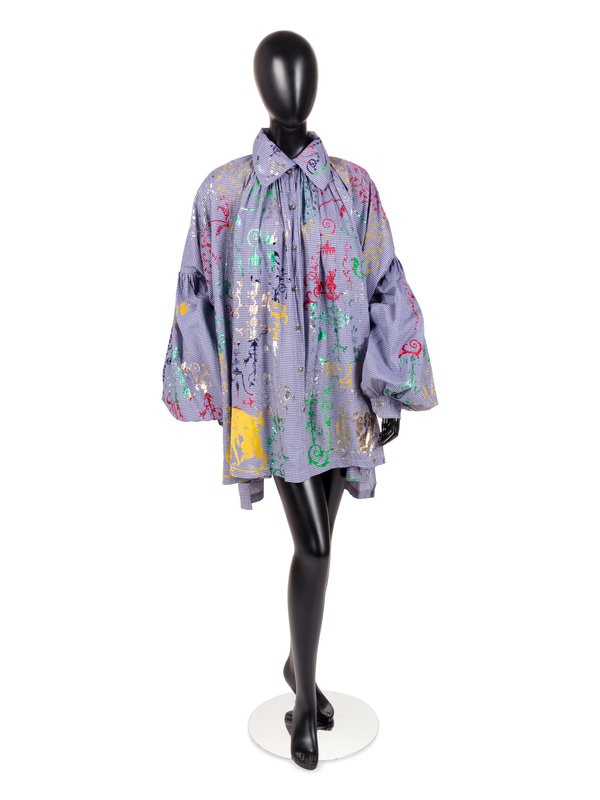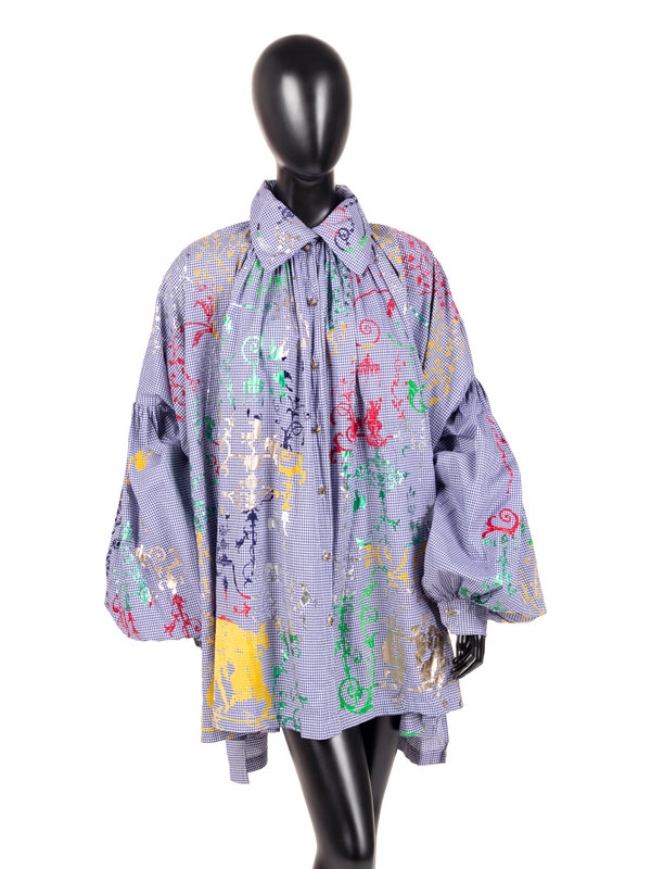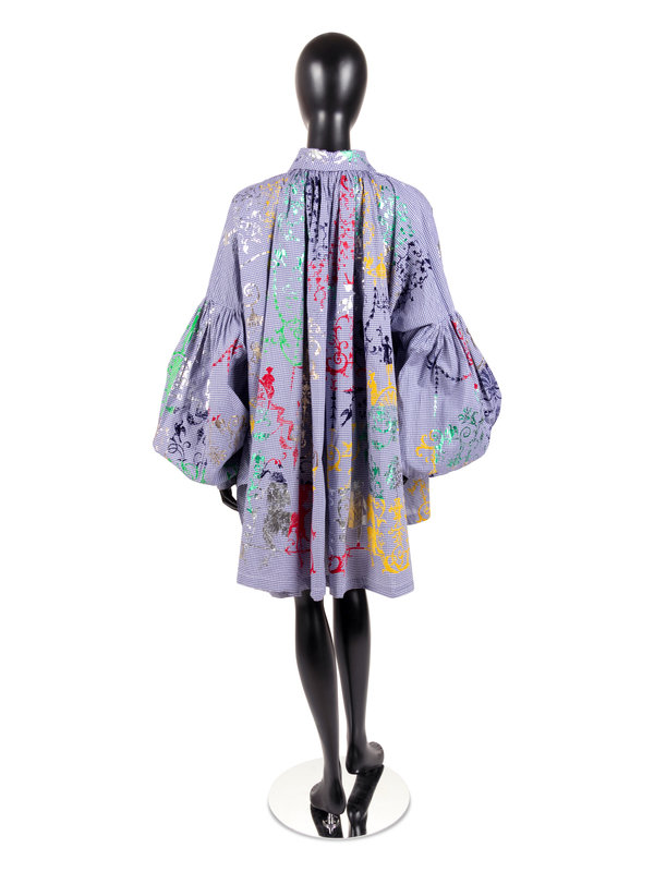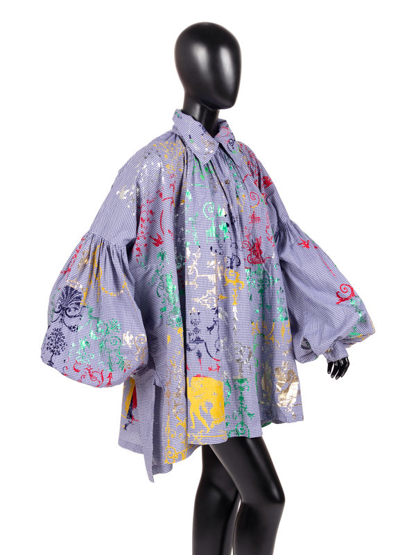 Blue and white cotton checkered smock printed with metallic and velvet designs, oversized rolled collar, gathered shoulders, oversized bishop sleeves, and center front button closure.