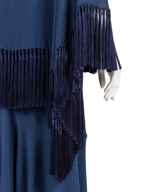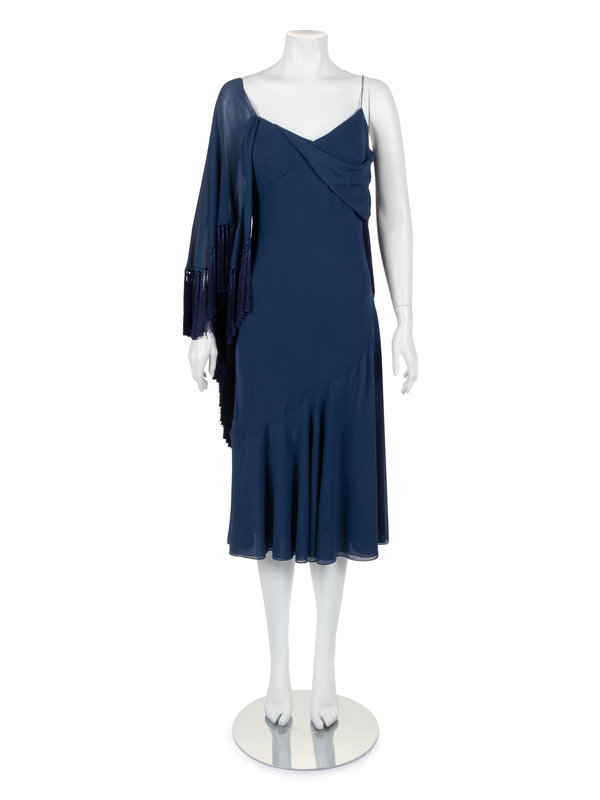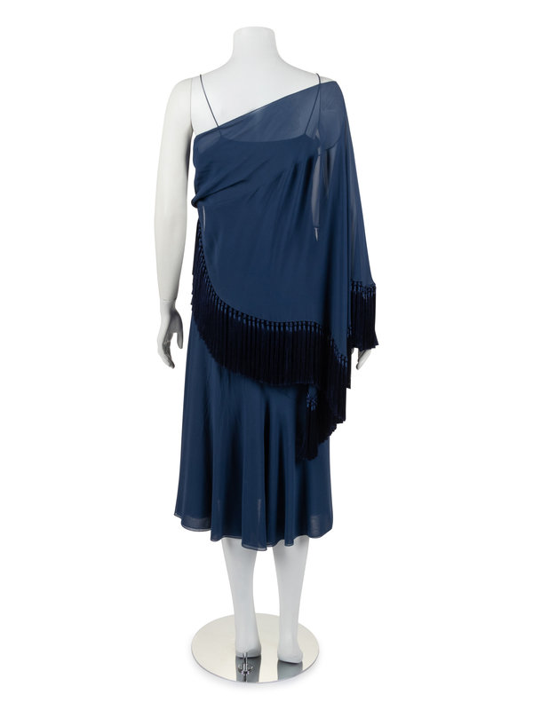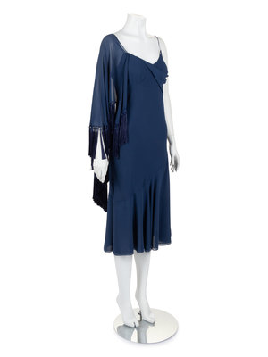 Blue silk chiffon slip-style dress with flounced skirt hemline, draped one-shoulder fringed capelet, and left side seam zipper closure.