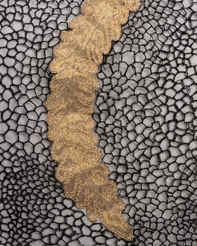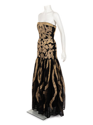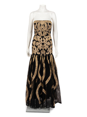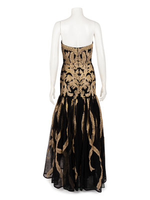 Black silk crepe strapless evening dress with black silk and floral gold-thread embroidered net, drop waisted full gathered skirt, and center back zipper closure.
