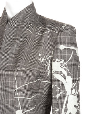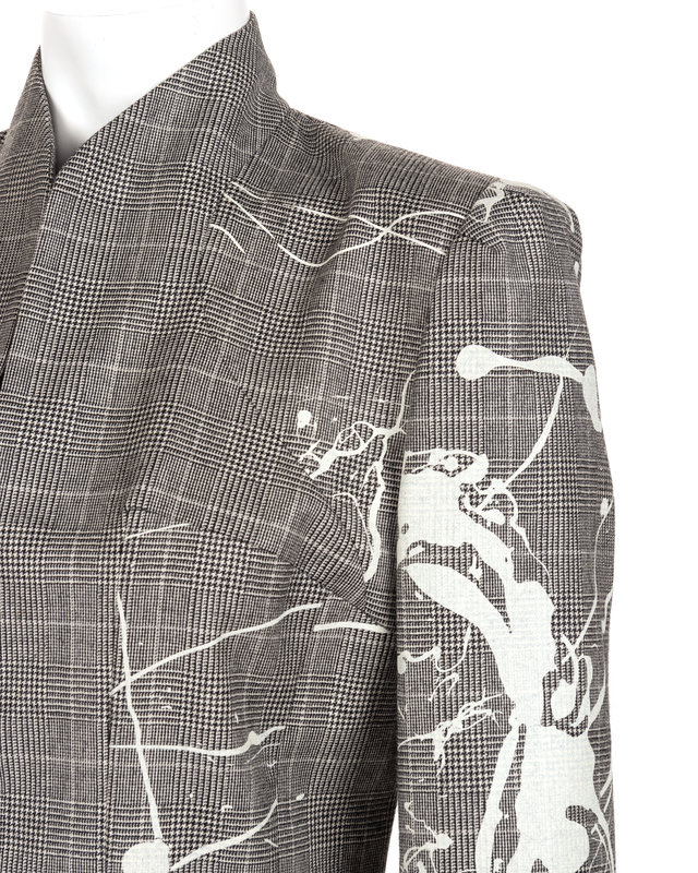 Black and white herringbone glen plaid wool two-piece skirt suit including a printed suit jacket with white splatter effect and hook and eye front closure; paired with matching pencil skirt.