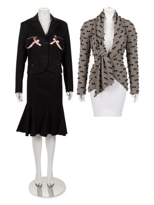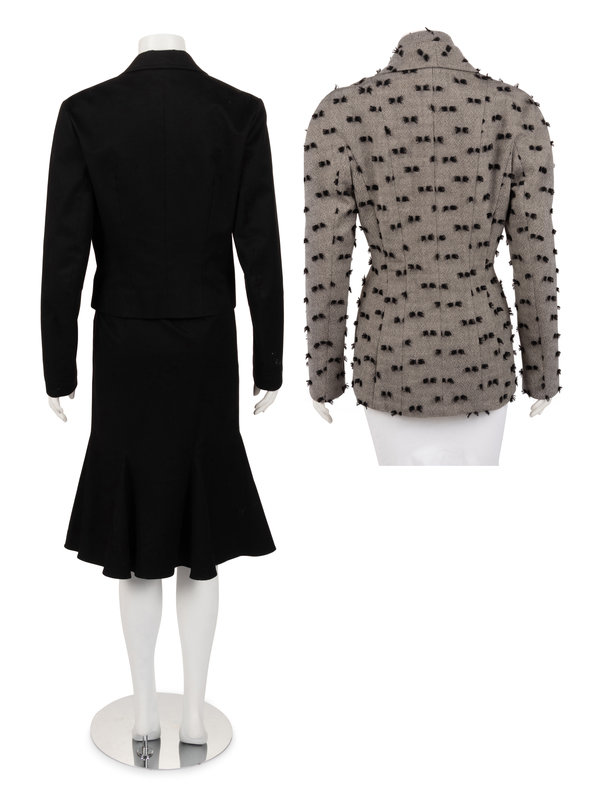 This lot contains three items; one jacket, one two-piece skirt suit.