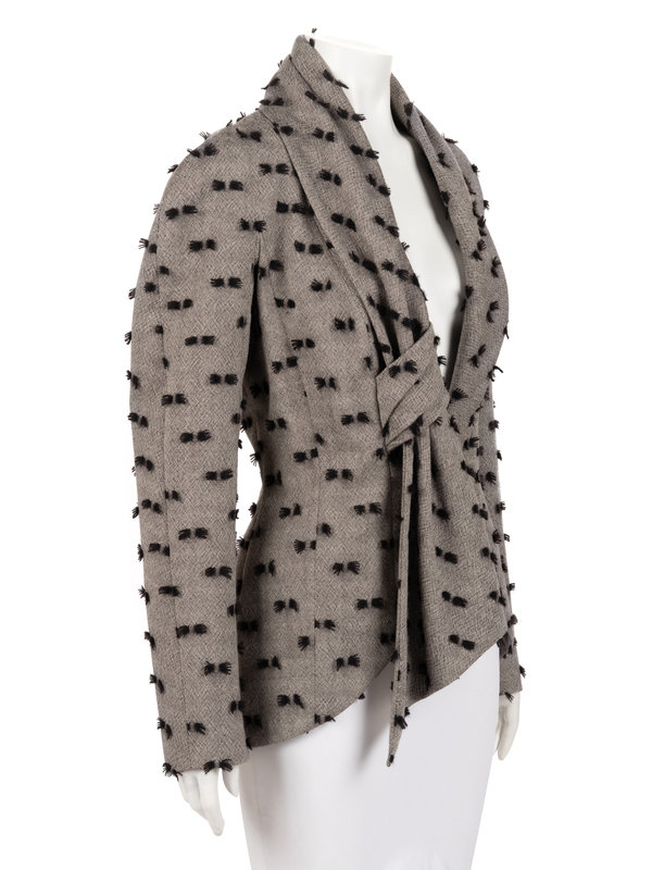 Grey wool long sleeve jacket with woven black yarn "lashes" detail, draped knotted neckline, and front button closure.