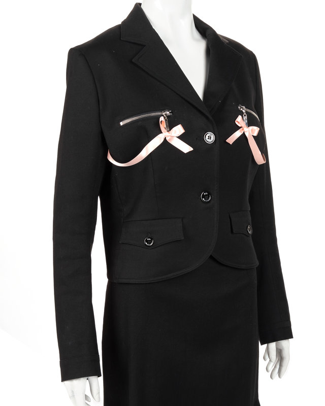Black cotton two-piece skirt set including a blazer with zippers trimmed in pink satin ribbon bows, paired with matching flounced hem skirt.