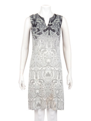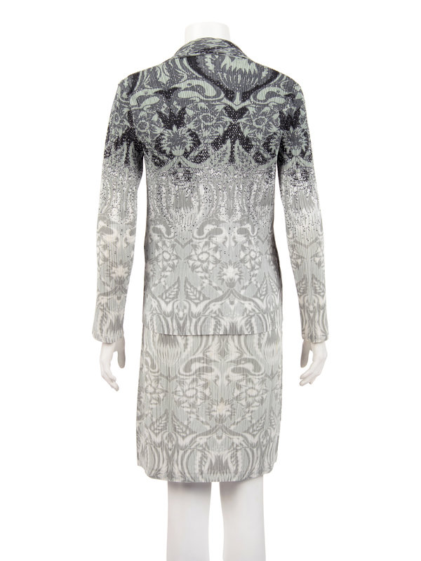 Gray, black, and white floral printed polyester pleated two-piece ensemble including a notched lapel button front jacket paired with matching sheath dress.
