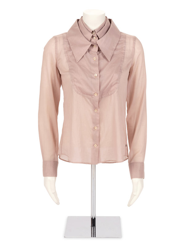 Deconstruction, tailoring, and refinement were the hallmarks of Viktor & Rolf’s tenth anniversary collection for Autumn/Winter 2003-2004. Like this triple-collared shirt, the designers showed layers of details pushed to their conceptual limits, bridging the avant-garde and modern wearability. A similar garment resides in the collection of the Costume Institute of the Metropolitan Museum of Art, accession no. 2011.164.