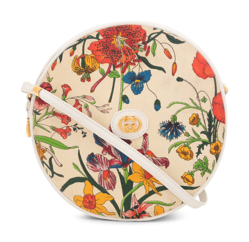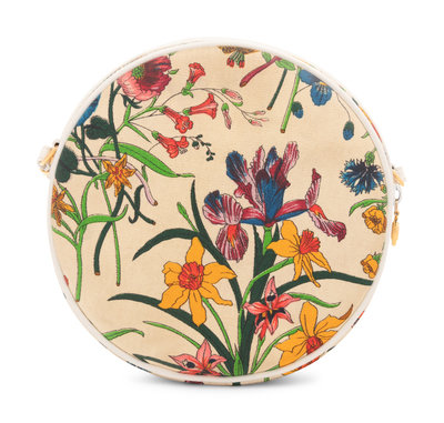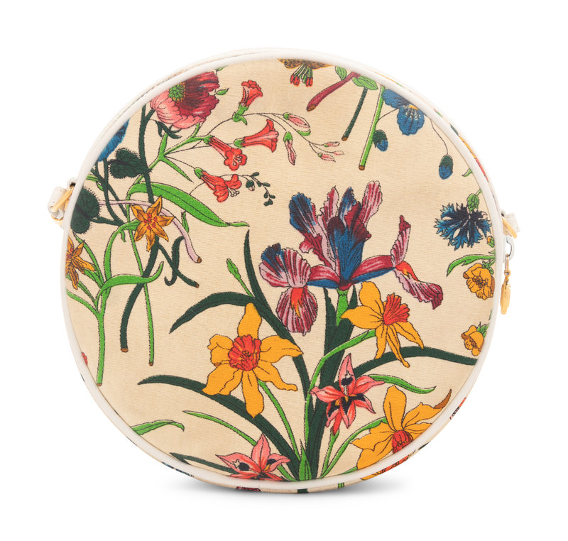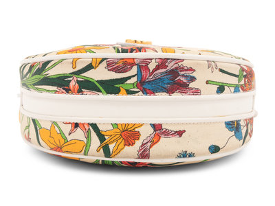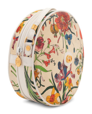 Floral printed canvas circular bag with white leather trim, shoulder strap, and top zipper closure.