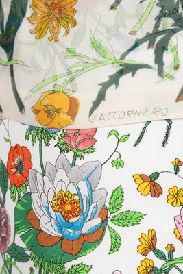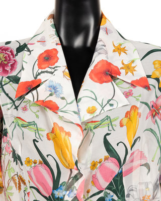 White silk chiffon floral print top with notched rolled lapel, French cuff long sleeves, and center front four button closure; paired with matching print cotton straight fit skirt with left side closure.