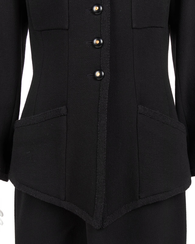 Black wool crepe skirt suit trimmed with black braid. Wide scoop neckline with four patch pockets on the front and a pointe hem at the center. Straight skirt that is hemmed with the same black braid that is on the jacket.