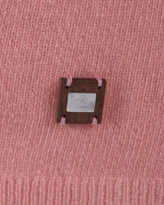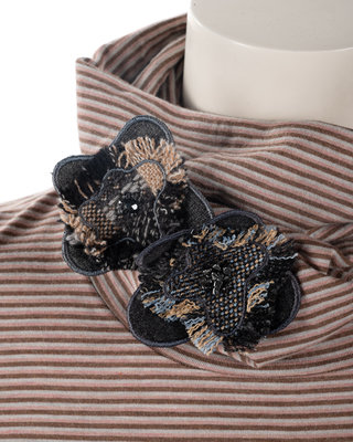 Viscose, cotton blend long sleeve turtleneck with brown, grey and pink stripes, quilted front pocket detail and two blue and beige floral pins on turtleneck. Found with original sales tag, listed price: $635.00.