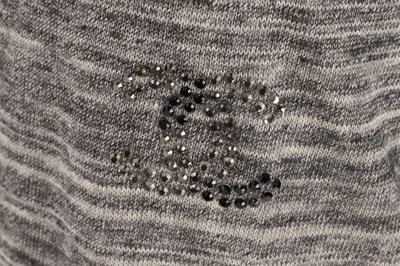 Grey long sleeve cotton top with embellishment at neckline and rhinestone logo on left shoulder. Found with original sales tag, listed price: $1,020.00.