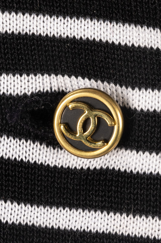 Black and white striped fil d'Ecosse long sleeve cardigan with logo decorative buttons down center front.