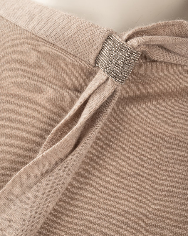 Beige cashmere blend long sleeve top with tie and embellished band at neckline.