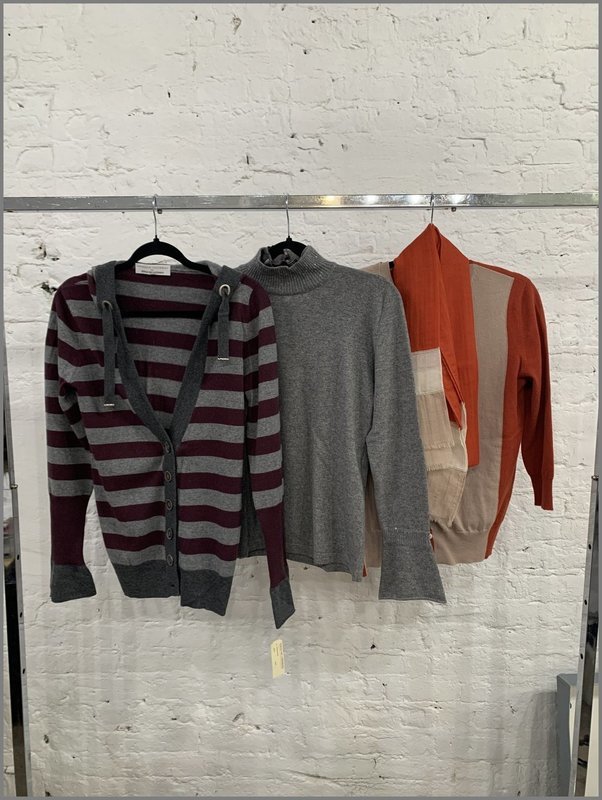 This lot includes four pieces; one cardigan, one sweater, one two-piece top set.