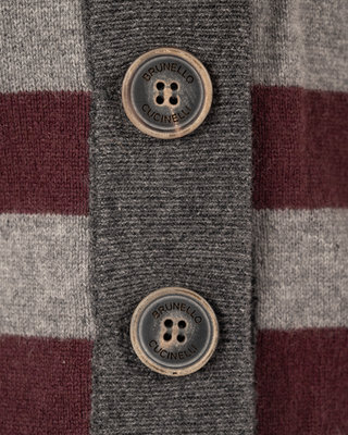 Grey and maroon cashmere striped, long sleeve, hooded sweater with center front button closure.
