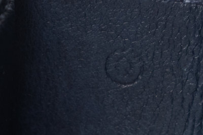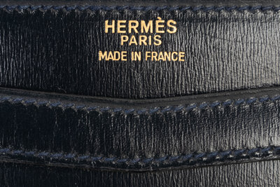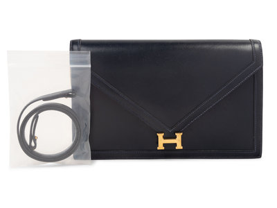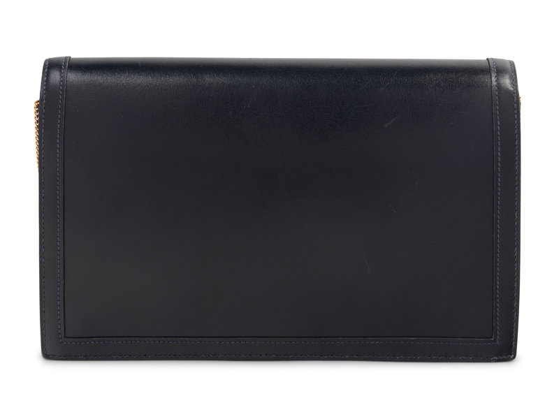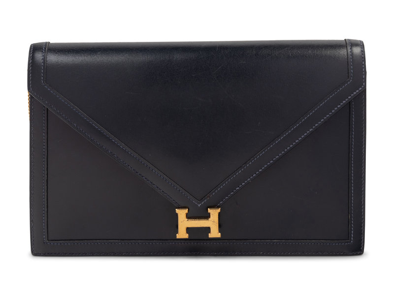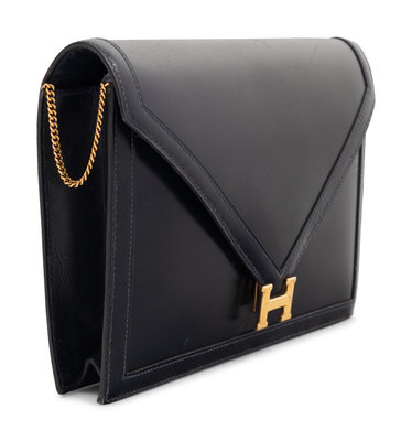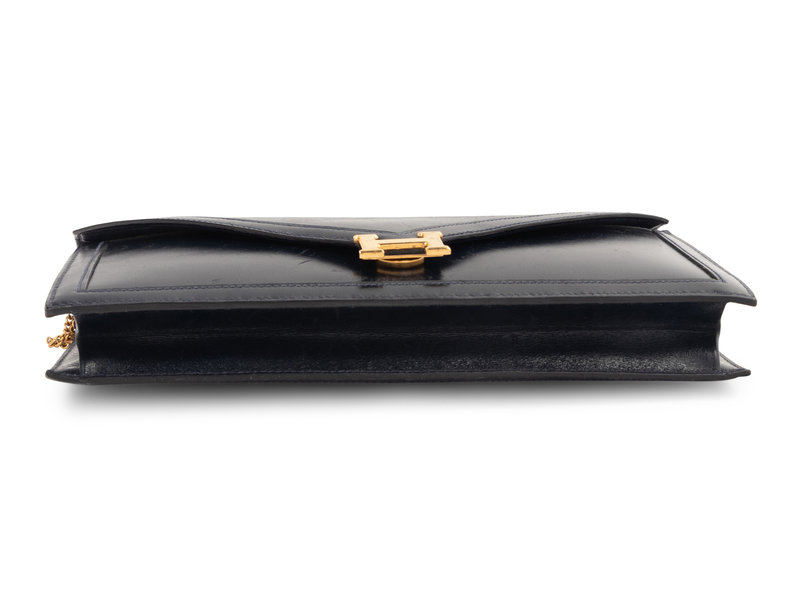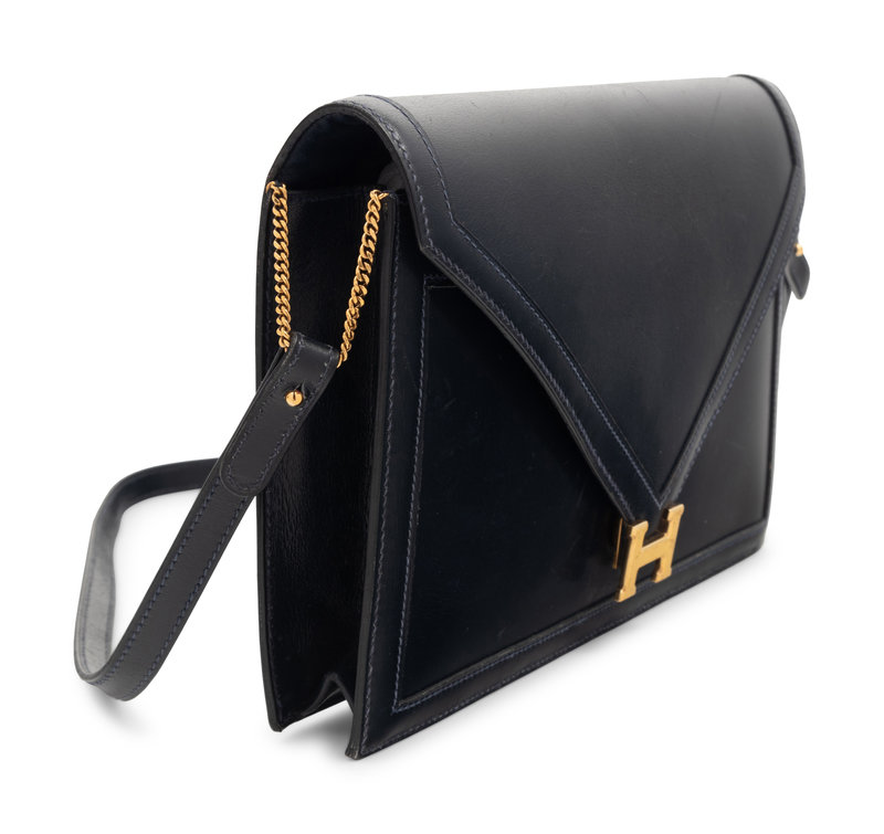Blue leather envelope flap bag trimmed with gold-tone chains at the sides for attaching blue leather shoulder strap and "H" clasp. Blue leather lining.