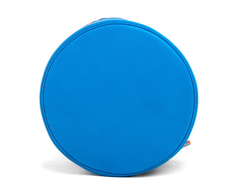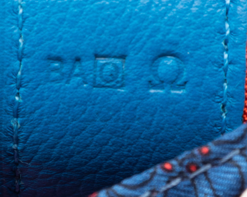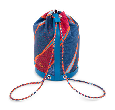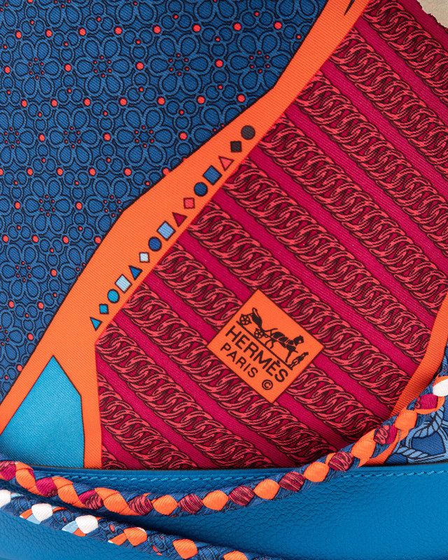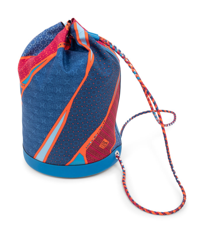 Silk "Carre en Cravates" Cool drawstring bucket bag trimmed in blue Hydra fjord leather, braided silk adjustable shoulder straps, and lined in orange silk.