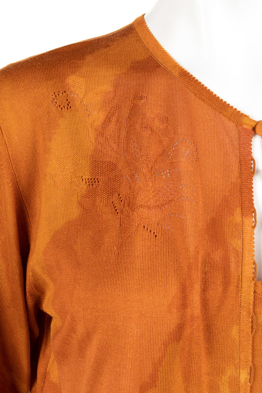 Orange silk printed cardigan with pointelle details and front button closure; paired with matching silk knit shell.
