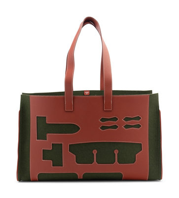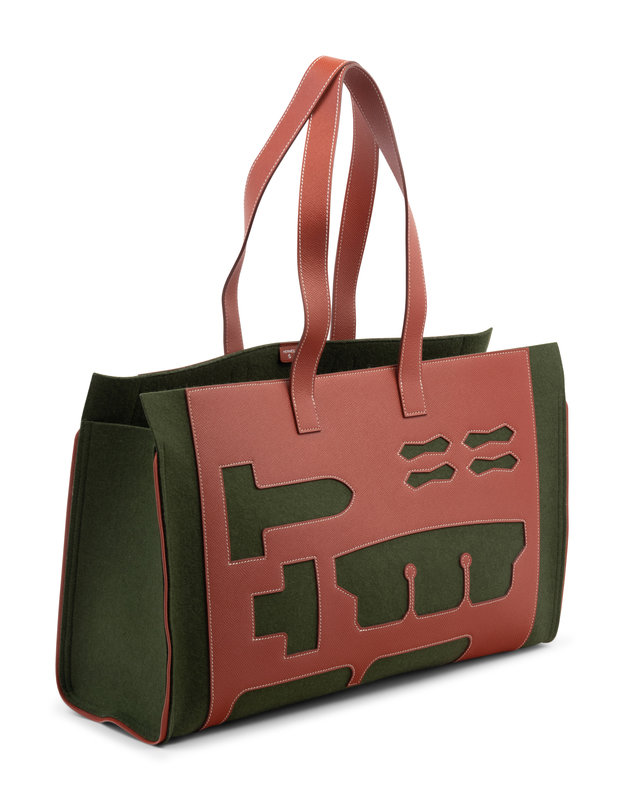 Green felt with cut-out brown leather large tote bag.