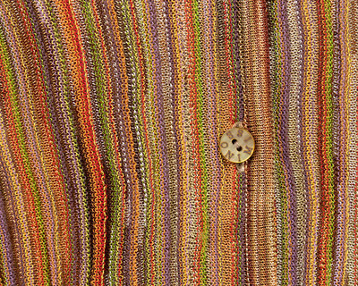 Red, green and purple rayon/nylon blend striped two piece set with cardigan and V-neck sleeveless shell.