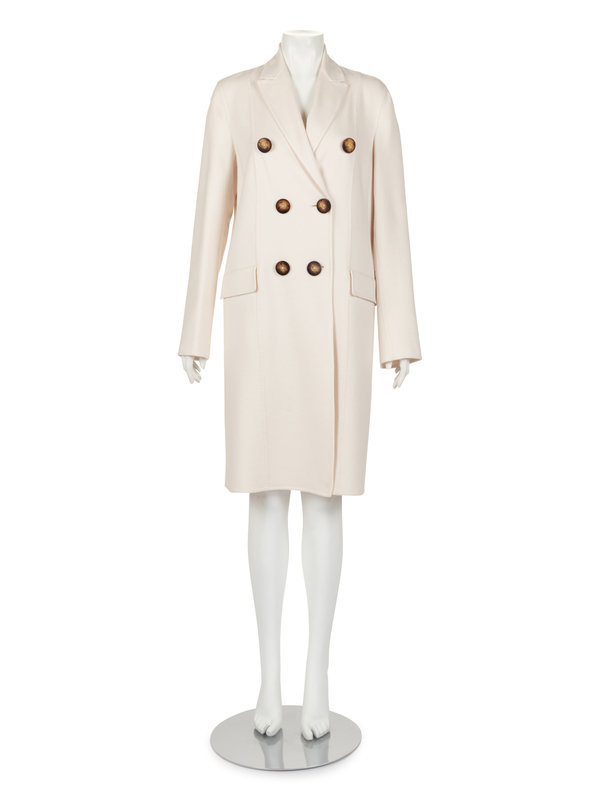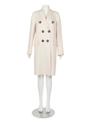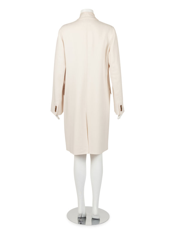 White cashmere double breast coat with peak lapels, front hip flap pockets, and front button closures.