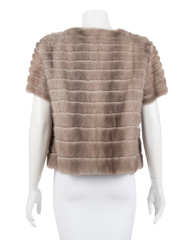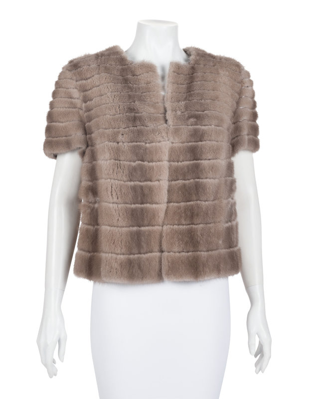 Beige mink short sleeve jacket with hook and eye center front closure.