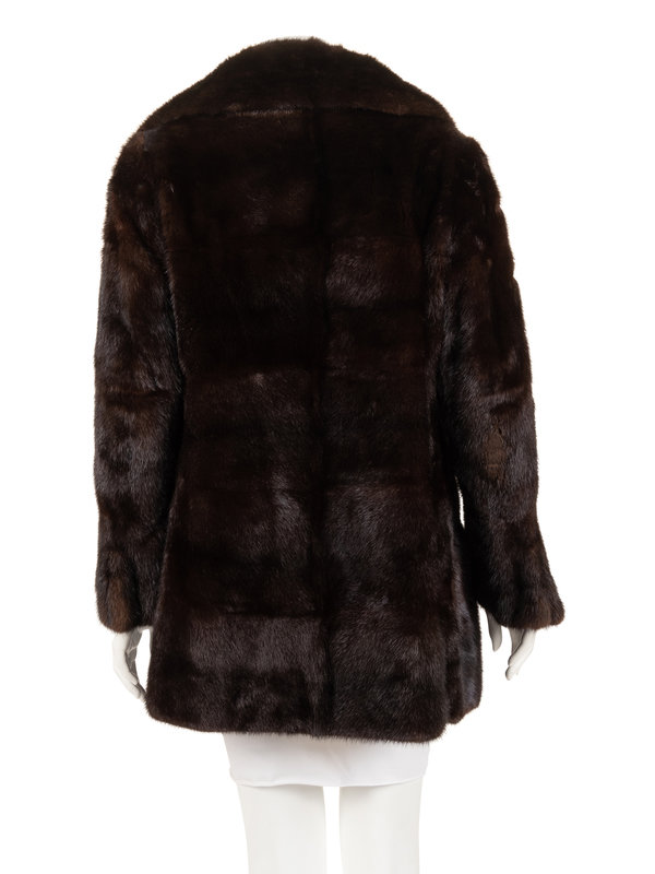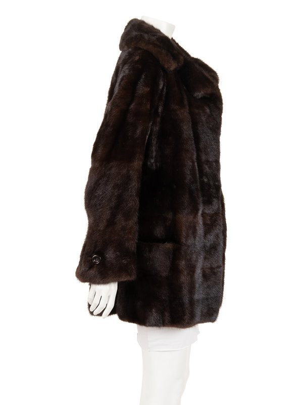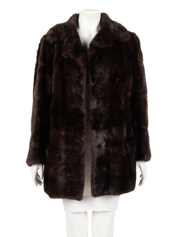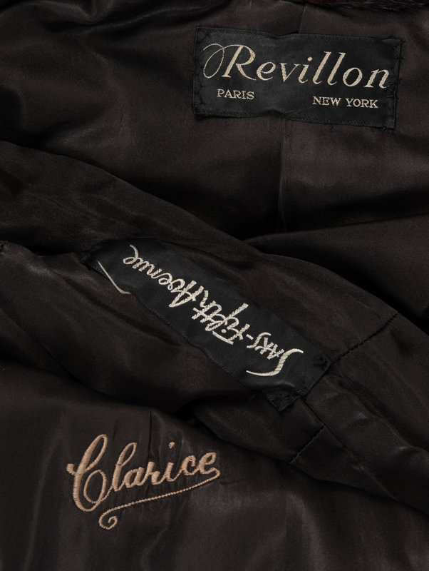 Brown mink coat with front pockets and hook and eye center front closure. "Clarice" monogrammed on front right lining.