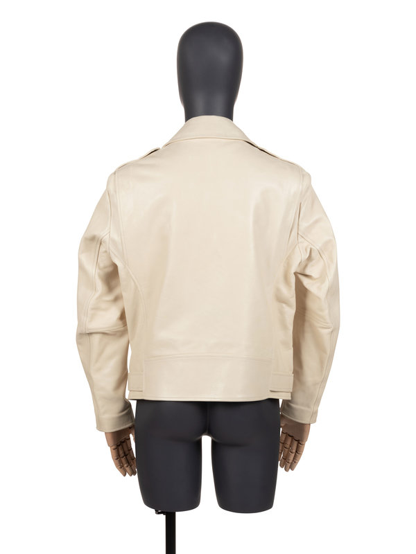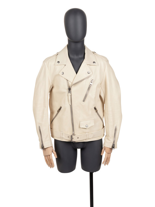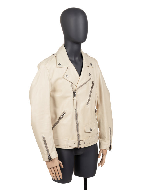 White leather men's biker jacket with off center zipper closure and belted waist.