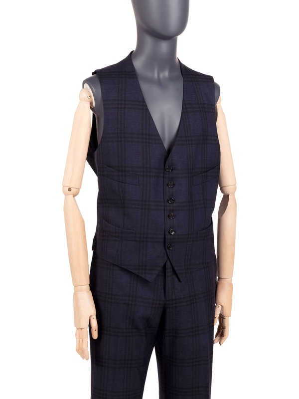 Dark blue wool glen-plaid two-piece suit including a peak lapel jacket with right two flap pockets and center front button closure; paired with matching vest and straight fit pants.