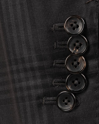 Dark grey wool glen-plaid two-piece suit including a peak lapel jacket with right two flap pockets and center front button closure; paired with matching straight fit pants.